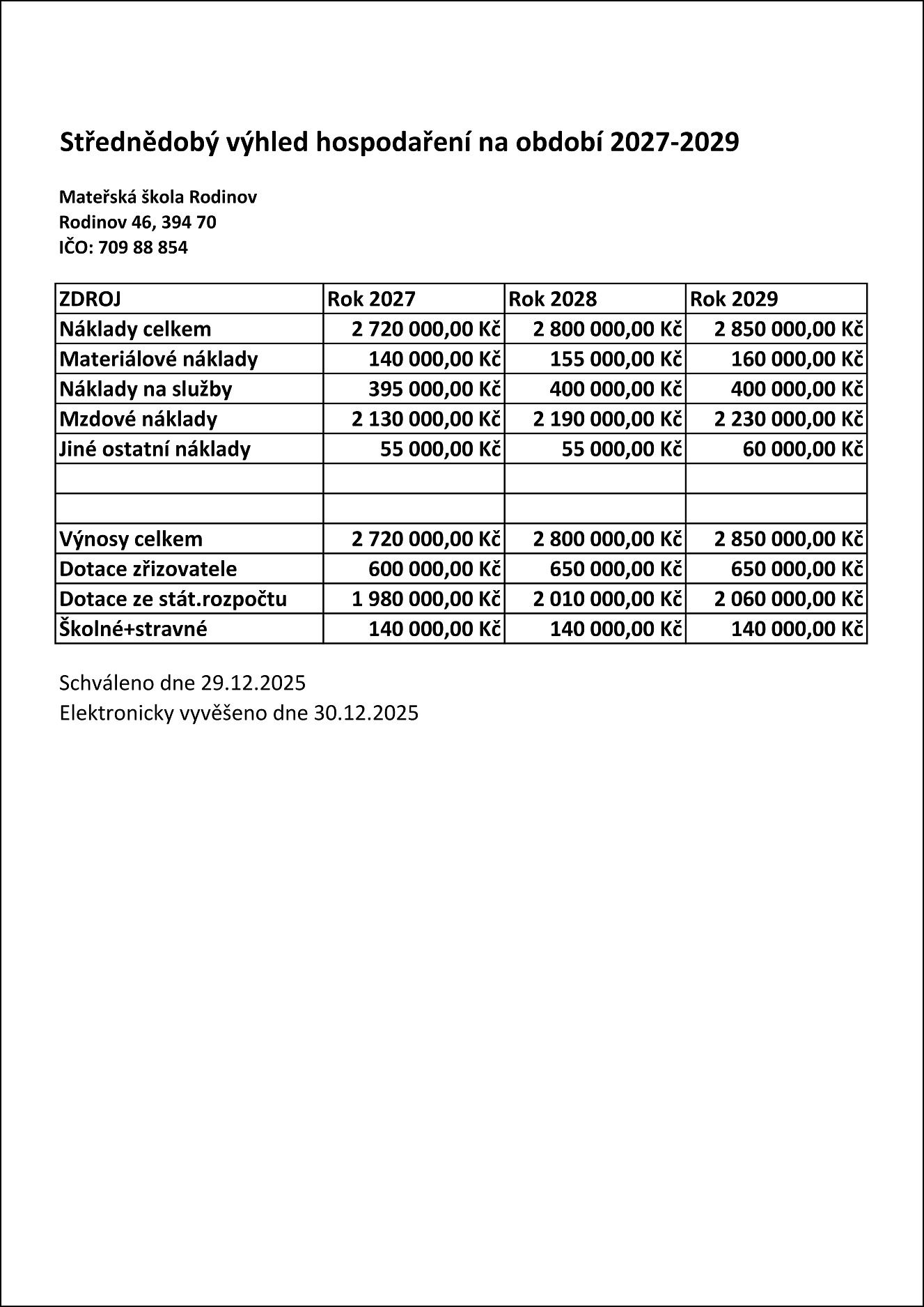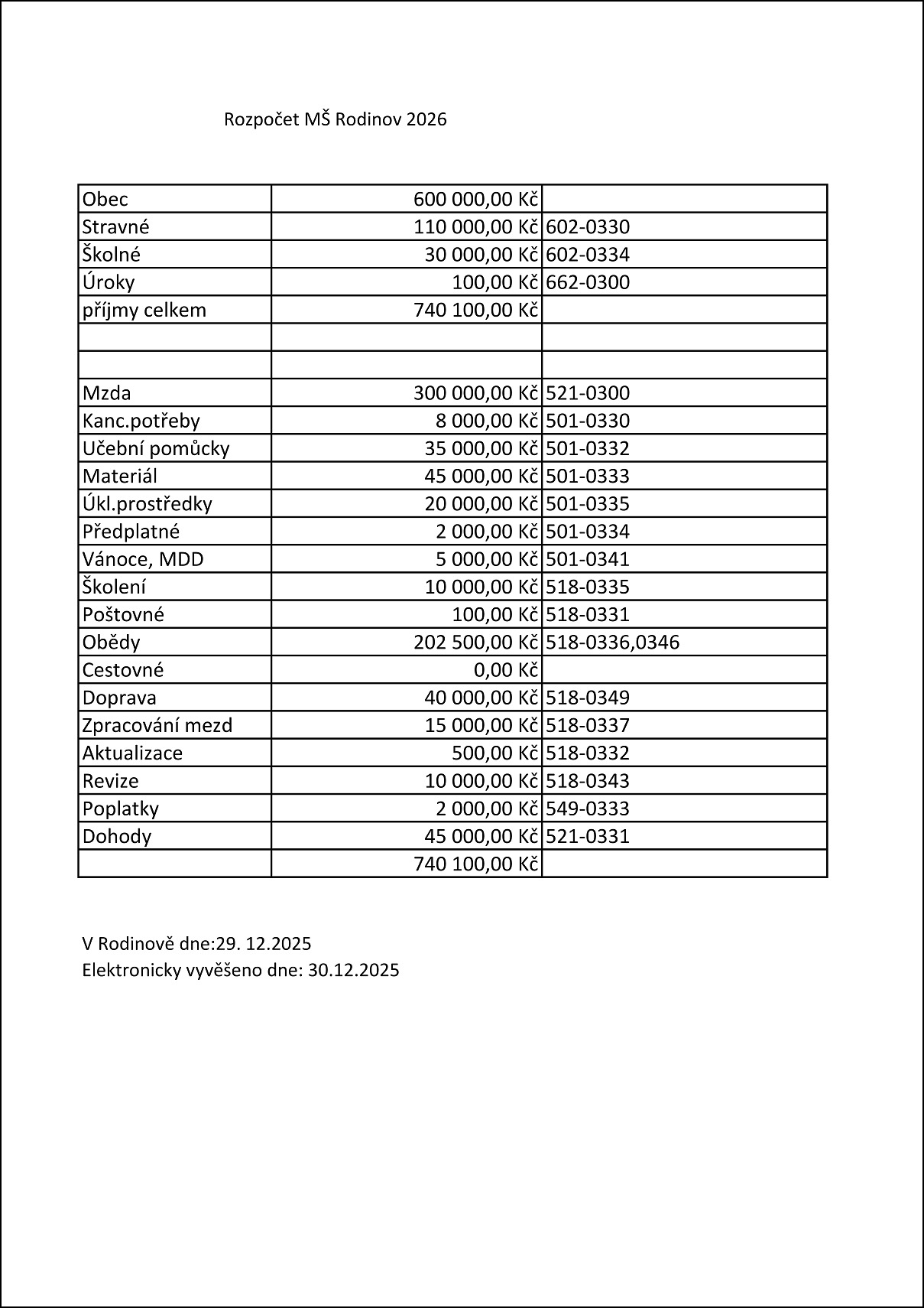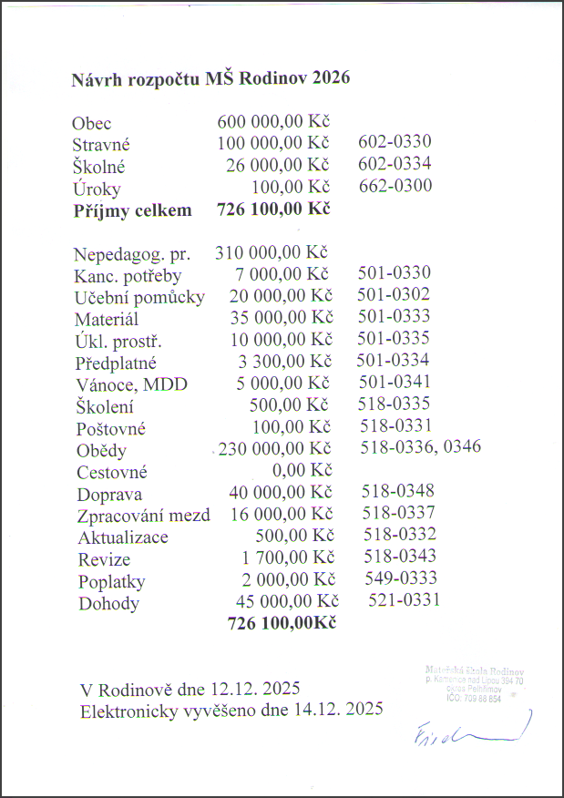 Rozpočet MŠ Rodinov 2026