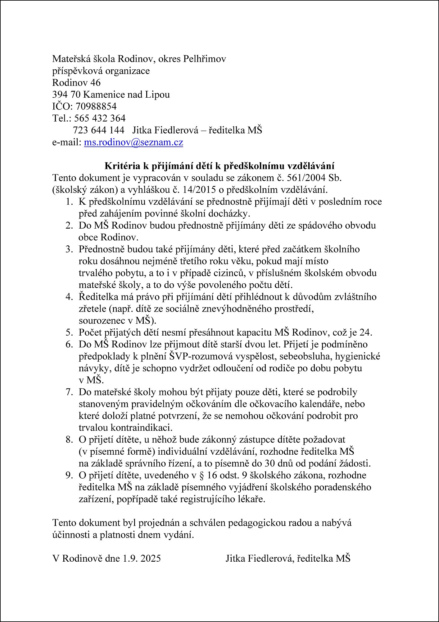 Kritéria k přijímání dětí k předškolnímu vzdělávání