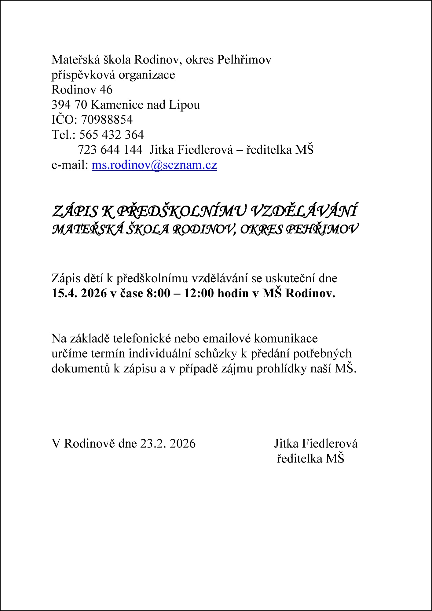 Informace k zápisu do MŠ
